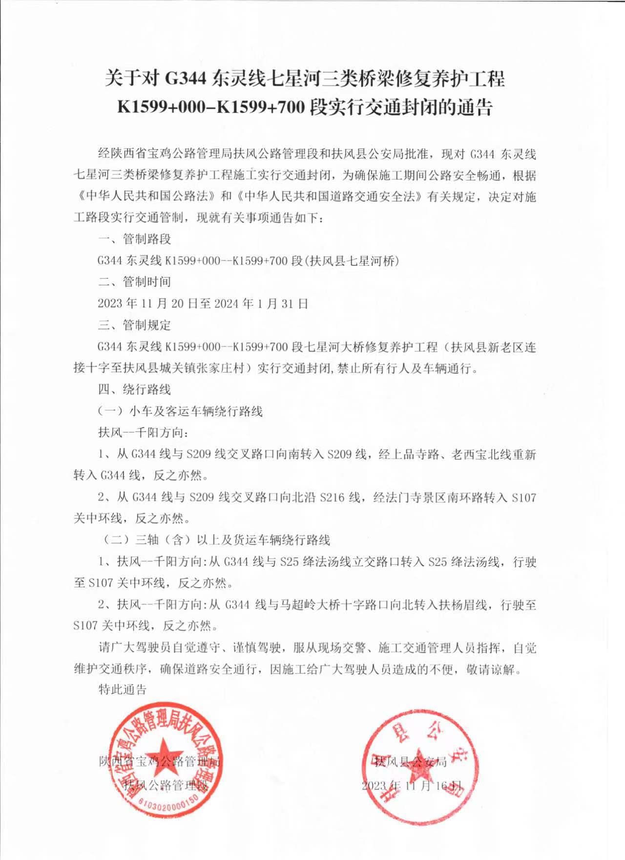 关于G344东灵线扶风七星河挢梁维修交通管制的通告