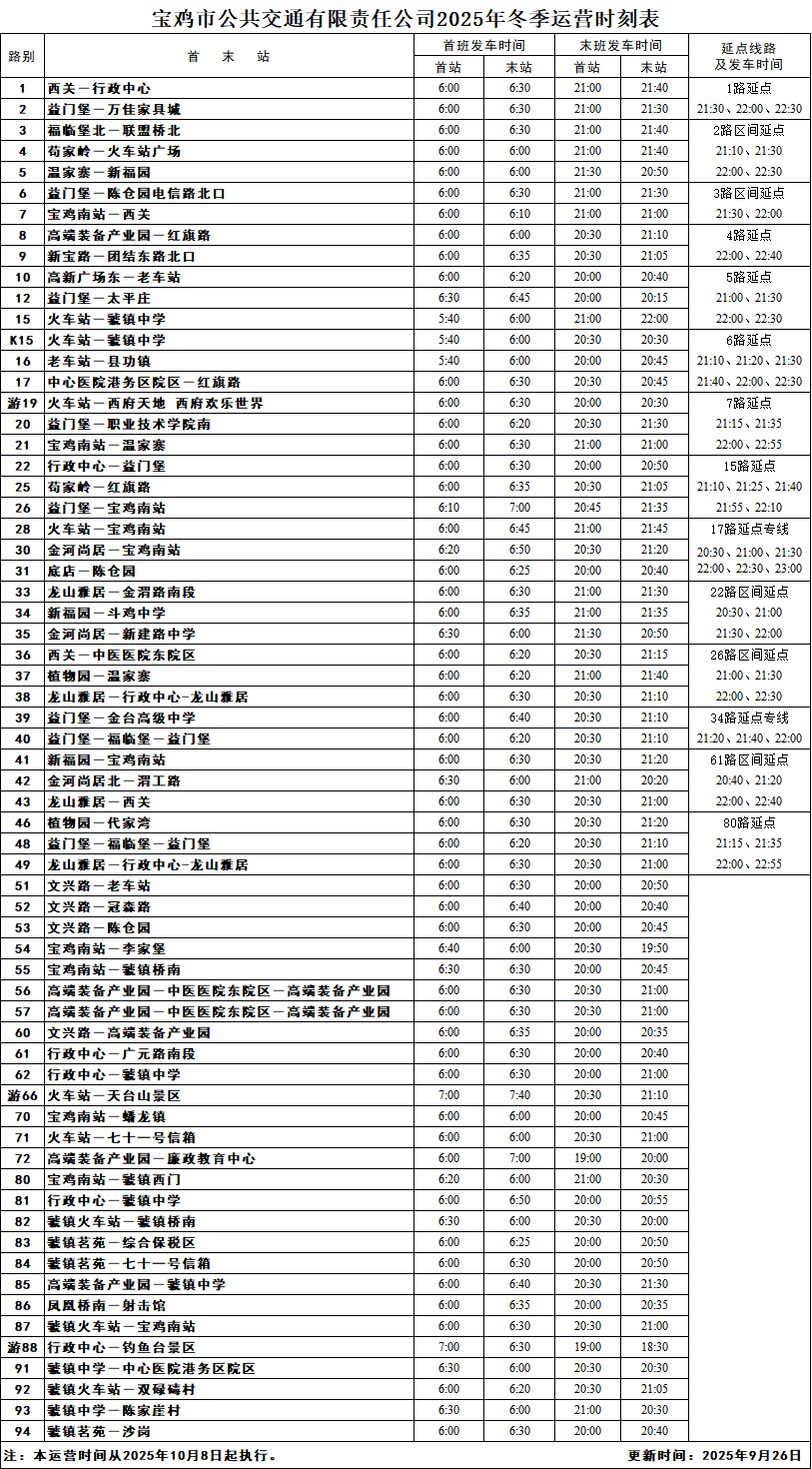 根据季节客流特点,2025年10月8日起,市公交公司所属公交线路将执行冬季运营时刻,敬请您留意关注,合理安排出行。