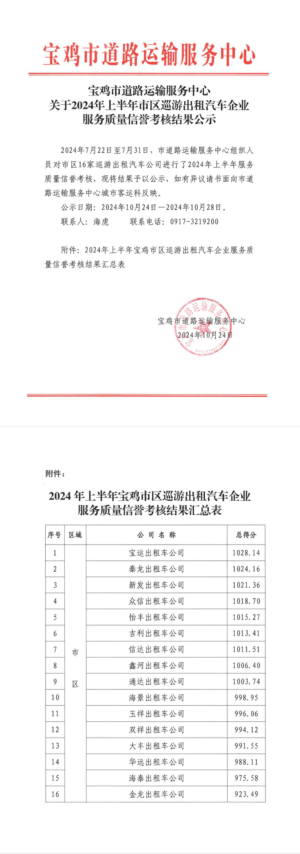 宝鸡市道路运输服务中心关于2024年上半年市区巡游出租汽车企业服务质量信誉考核结果公示