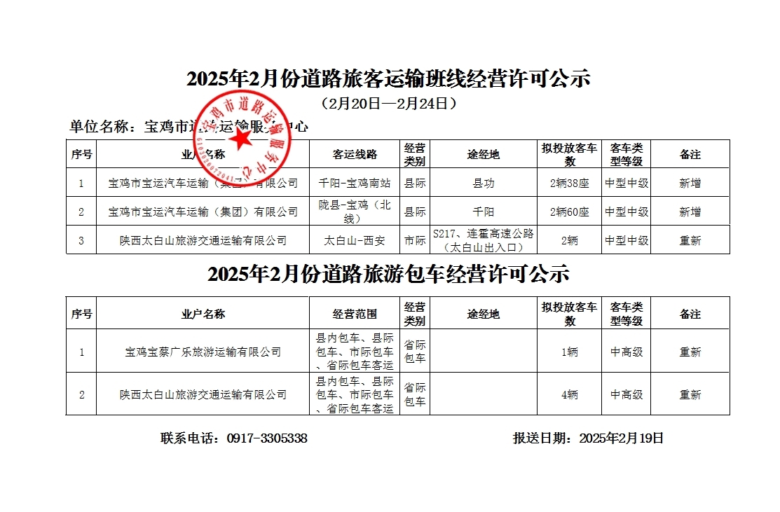 2025年2月份道路旅客运输班线经营许可公示