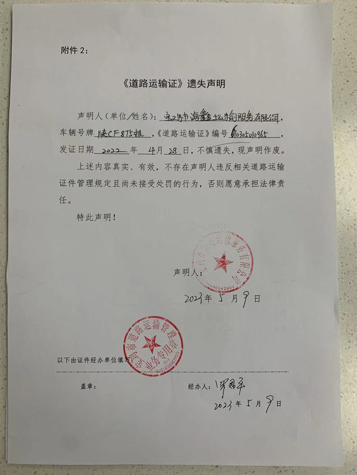 宝鸡市海鑫运输服务有限公司《道路运输证》遗失声明