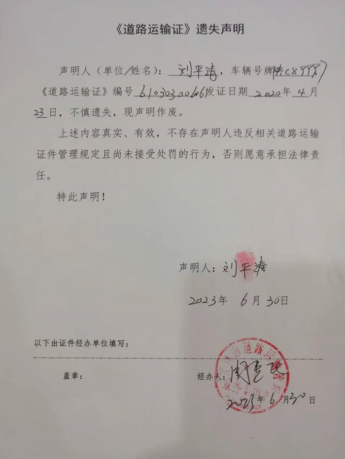 刘平涛《道路运输证》遗失声明