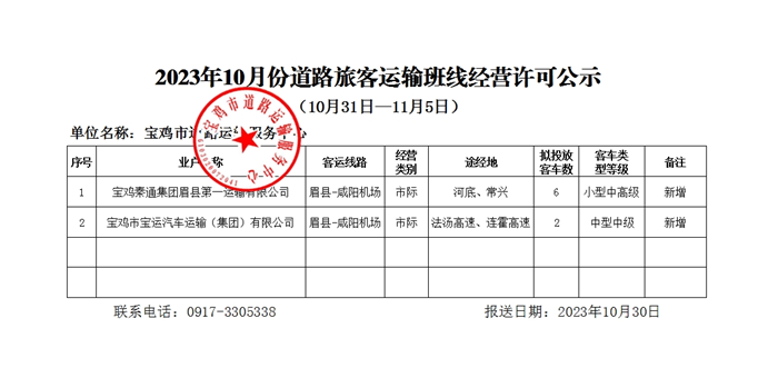 2023年10月份道路旅客运输班线经营许可公示