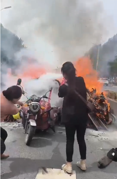情况危急,张巧平、杨海莲立刻停车冲上前。因火势凶猛难以靠近,他们急忙抄起车上拖把奋力扑打车头火焰,降低火势蔓延速度。随后,又迅速从车中取出灭火器,精准喷射,最终将大火彻底扑灭。