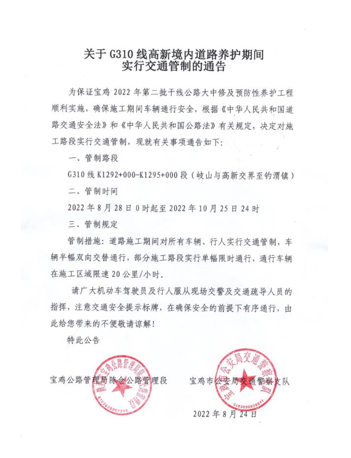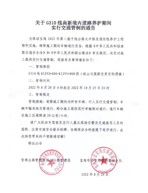 关于G310线高新境内道路养护期间实行交通管制的通告