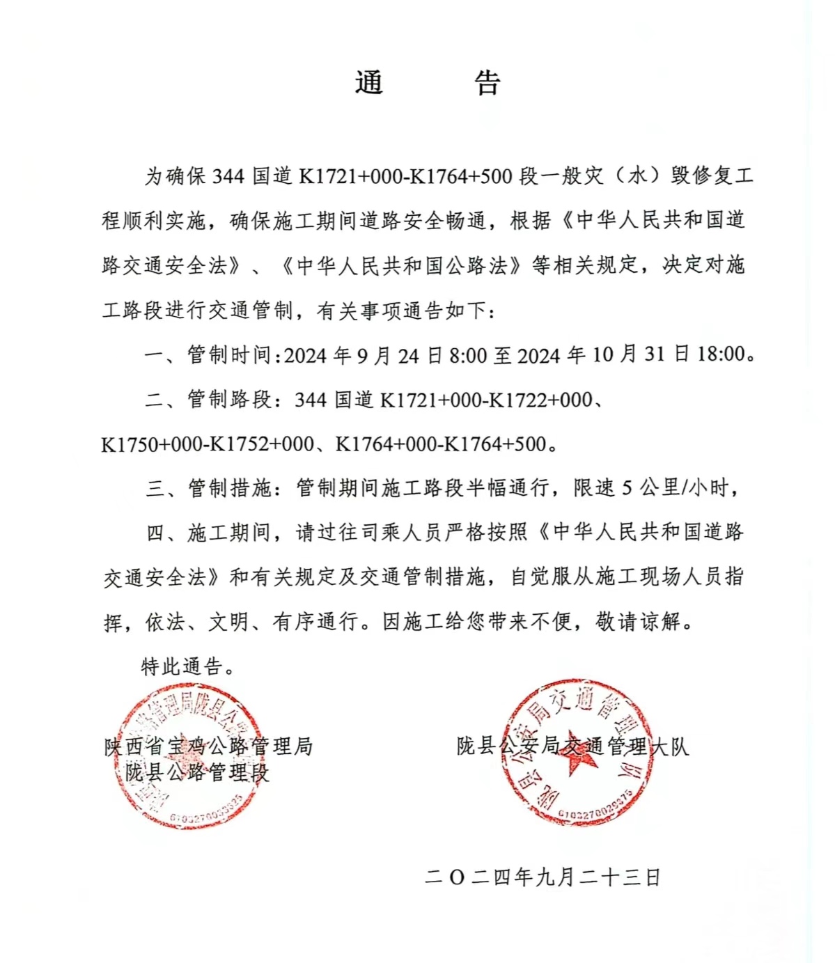 关于G344国道K1721+000-K1764+500(陇县东风镇相公山至陇县温水镇火烧寨村)交通管制路况信息
