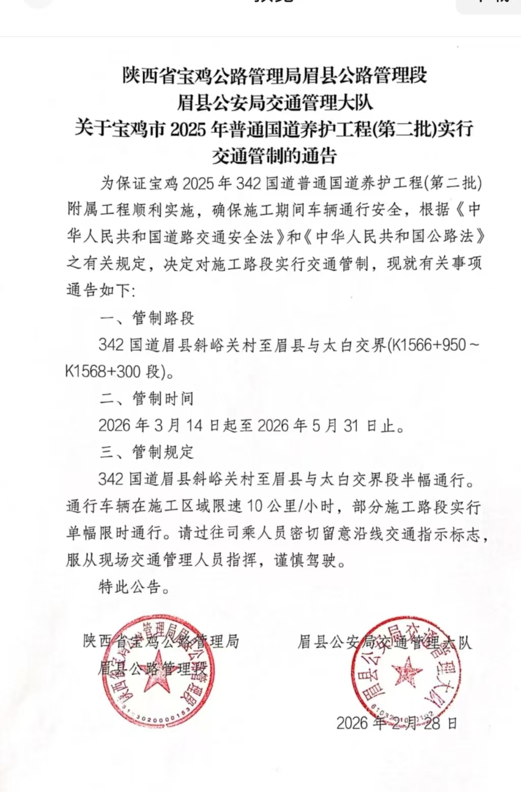 关于宝鸡市 2025 年普通国道养护工程(第二批)实行交通管制的通告