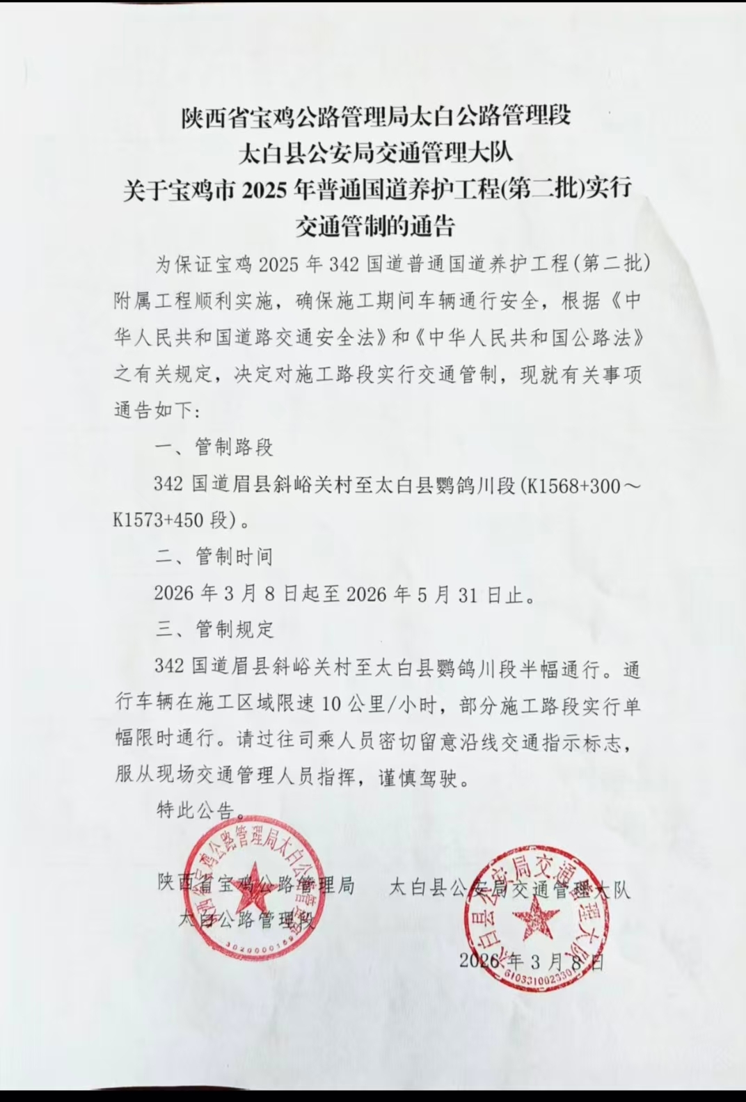关于对342国道眉县斜峪关村至眉县与太白交界(K1566+950~K1568+300 段)进行交通管制的通告
