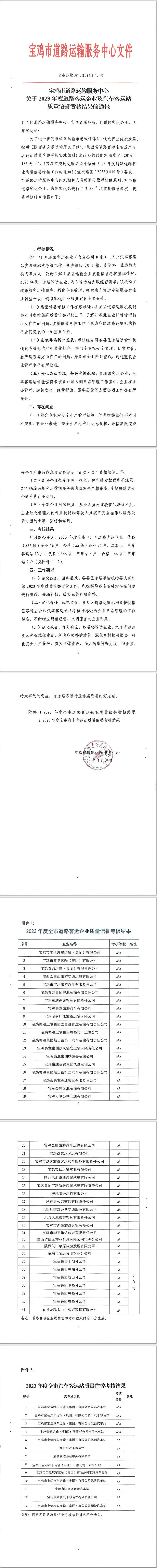 宝鸡市道路运输服务中心关于2023年度道路客运企业及汽车客运站质量信誉考核结果的通报