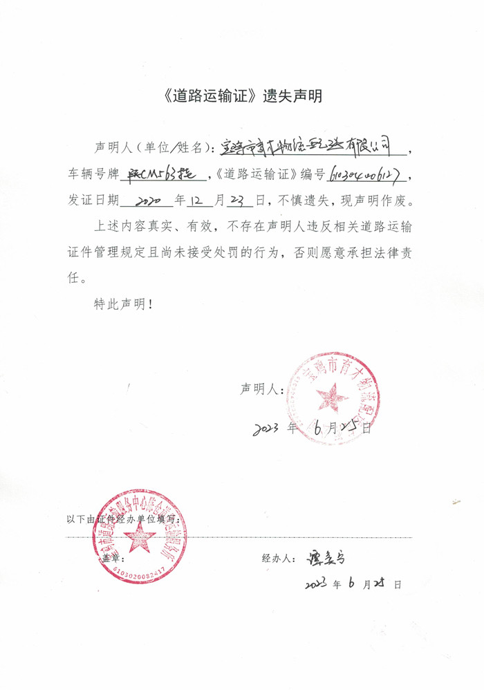 宝鸡市育才物流配送有限公司《道路运输证》遗失声明