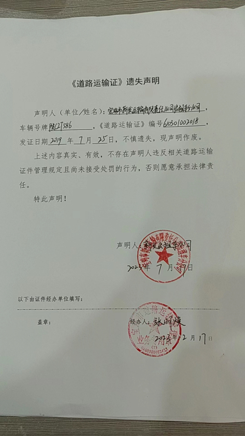 宝鸡市新发运输有限责任公司出租车分公司《道路运输证》遗失声明