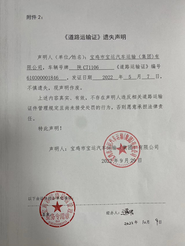 宝鸡市宝运汽车运输(集团)有限公司《道路运输证》遗失声明