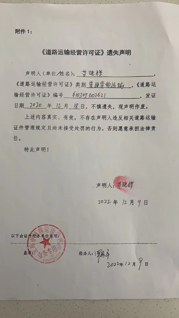 苟晓辉《道路运输经营许可证》遗失声明