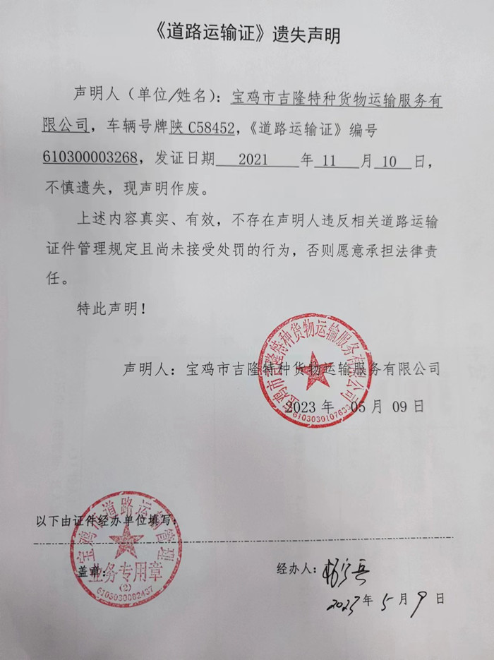 宝鸡市吉隆特种货物运输服务有限公司《道路运输证》遗失声明