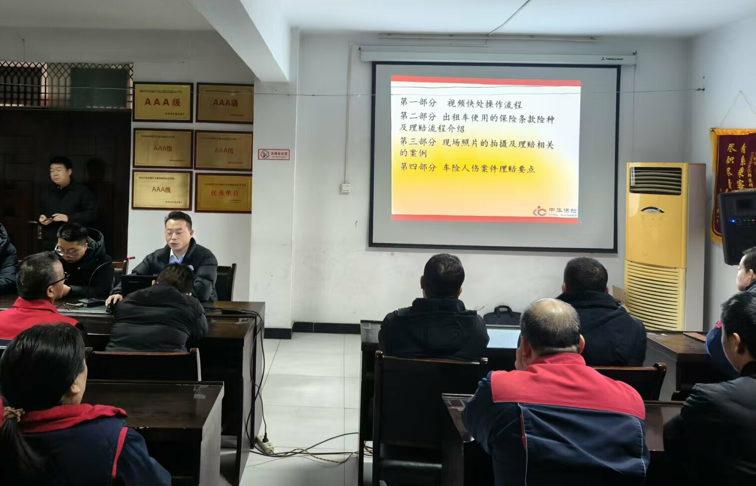 培训会上,中华保险公司资深讲师晁卫东围绕”保险服务与风险防控“主题展开系统讲解。内容涵盖车险理赔流程、事故责任划分、保险条款解读等核心内容,并结合出租车行业特性,重点解析了“第三者责任险”“车上人员险”等险种的实际应用场景。针对驾驶员普遍关注的“轻微事故快速处理”“人伤事故注意事项”等焦点问题,讲师通过流程图解与情景模拟,帮助驾驶员建立清晰的处置思路。