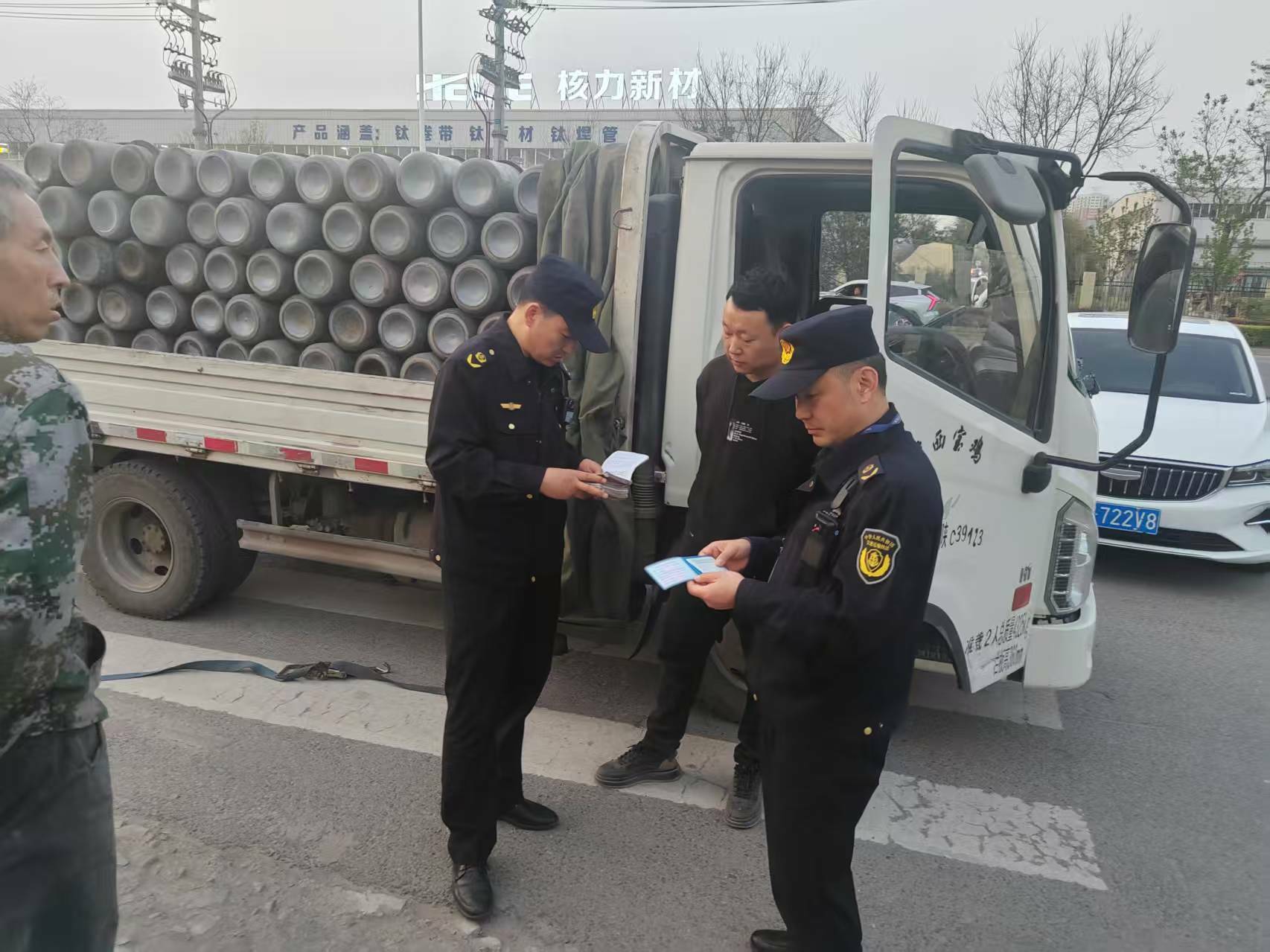 2025年4月10日夜8时17分,这辆轻型货车最终在高新大道与凤凰五路十字路口附近被四大队执法人员拦截检查。该车驾驶员为高某某,随车人员为李某,经现场询问得知:高某某驾驶陕CXXXX轻型普通货车,从宝鸡市某气体公司运载83瓶压缩气体(气瓶规格为 40升/瓶)其中有 22瓶压缩二氧化碳气体、61瓶混合压缩气体(80%氩气和 20%二氧化碳混合气体)运至岐山县五丈原镇某公司,同行人员为李某。压缩二氧化碳气体、压缩混合气体均属于《危险货物品名表》列明的危险货物,属于 2类 2项危险货物,必须使用具有相应资质的危险货物专用车辆进行运输,一切普货运输车辆拉运危险货物均属违法行为。经现场检查:该车无《道路运输证》,当场也无法提供其他有效证明,涉嫌未取得道路危险货物运输许可,擅自从事危险货物运输的违法行为、存在重大的安全隐患。执法四大队副大队长彭鹏果断做出决定:立即中止违法行为,第一时间将案情上报上级领导申请立案,并按规定将车辆押运返回至装货地点某气体公司,消除安全隐患、以免造成重大安全事故。