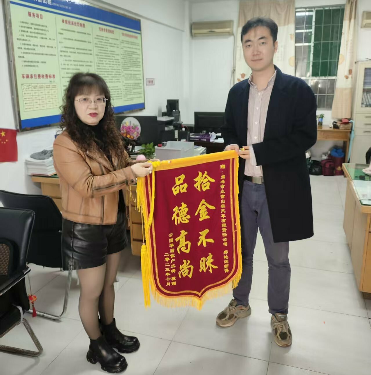 后续,王先生顺利领回了自己失而复得的全部物品。为表达对郑艳辉师傅拾金不昧高尚品格的诚挚谢意,10月13日上午,王先生特意定制了一面“拾金不昧,品德高尚”的锦旗,送至众信出租车公司。