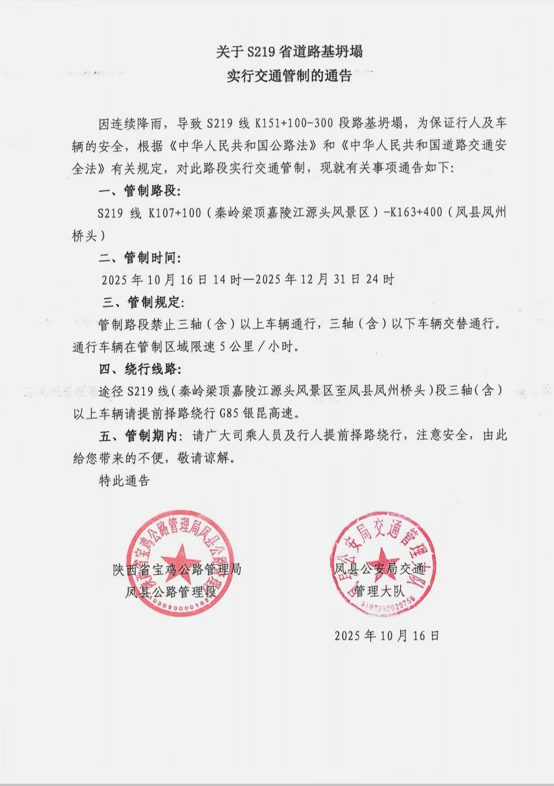 关于S219省道路基坍塌实行交通管制的通告
