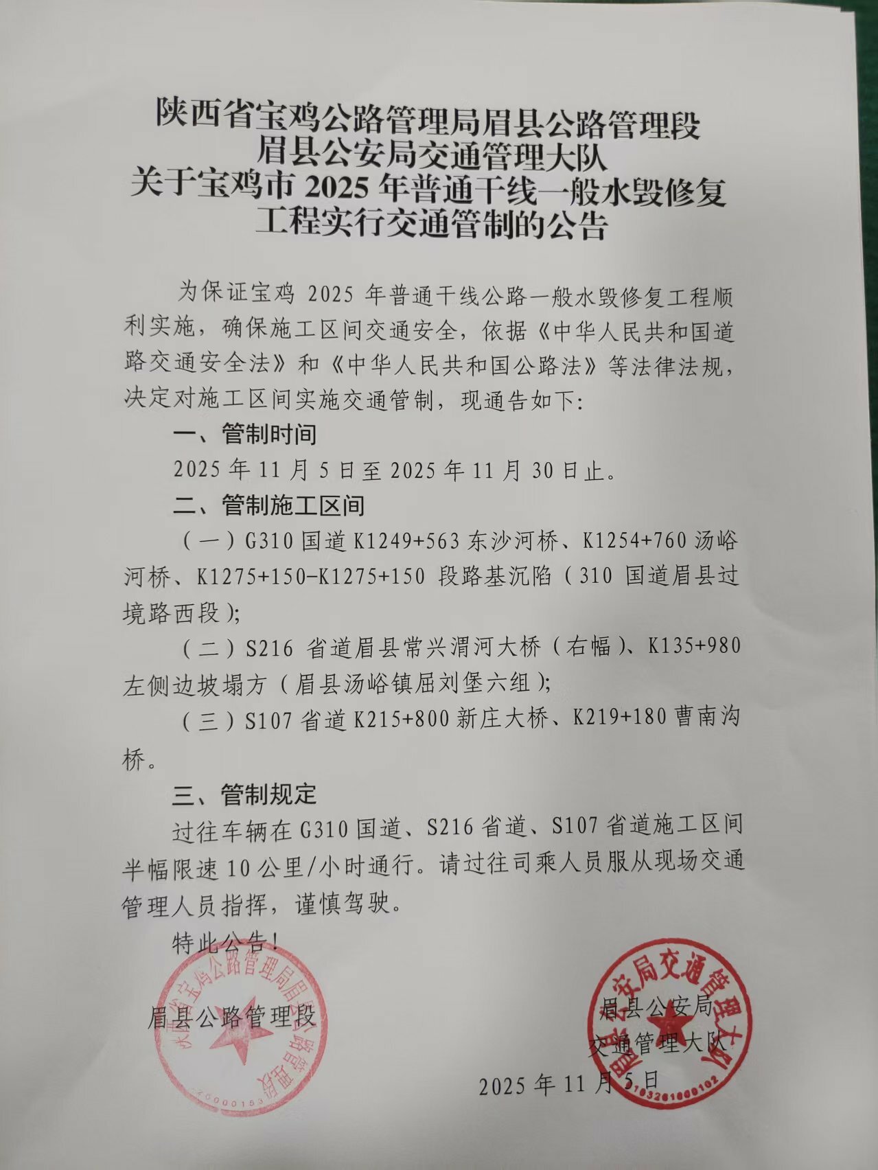 关于宝鸡市2025年普通干线一般水毁修复工程实行交通管制的公告