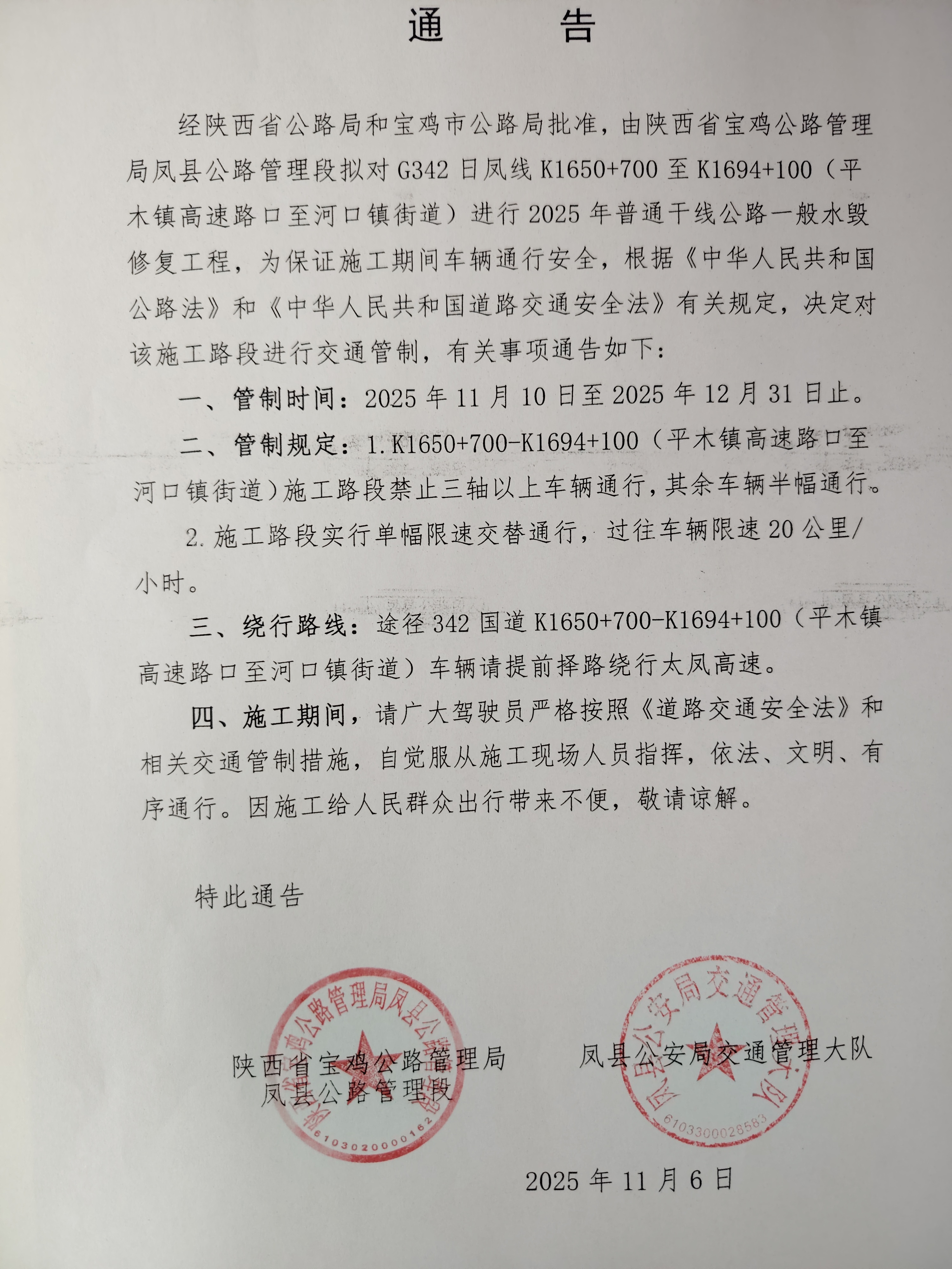 关于G342日凤线K1650+700至K1694+100(平木镇高速路口至河口镇街道)交通管制的通告
