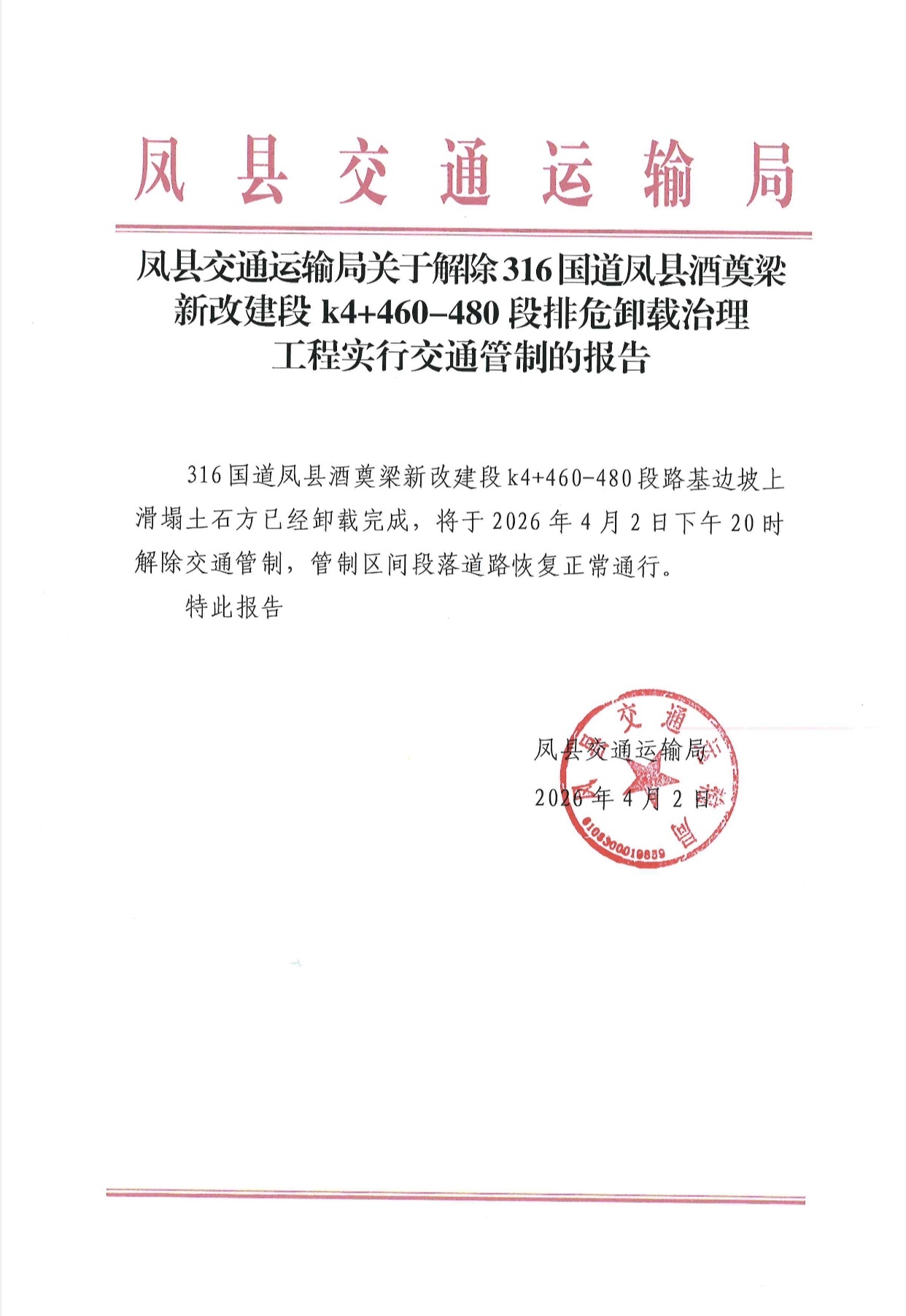 凤县交通运输局关于解除316国道凤县酒奠梁新改建段 k4+460-480 段排危卸载治理工程实行交通管制的报告