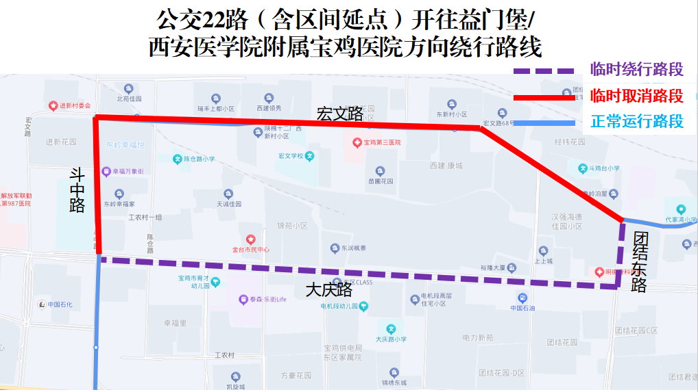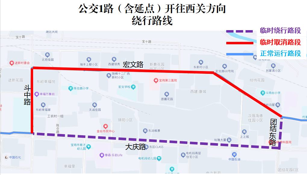 临时取消站点:团结东路北口(路北站)、西建康城(路北站)、宝鸡第三医院十里铺(路北站)、大荣纺织(路北站)、斗鸡中学(路西站)